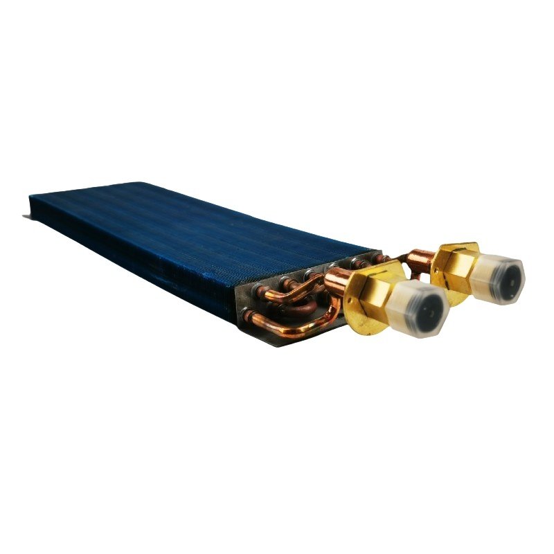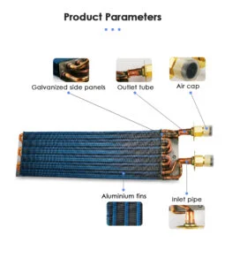 This product uses aluminum foil with a thickness of 0.15-0.20 millimeters, and the fin spacing can be 3-6.5 millimeters, effectively preventing frosting and freezing. The fin strength is relatively high and can also be used for agricultural machinery and construction machinery vehicles. The working environment is relatively dirty, and high-pressure water guns can be used to rinse the heat exchanger to improve the service life of the product.